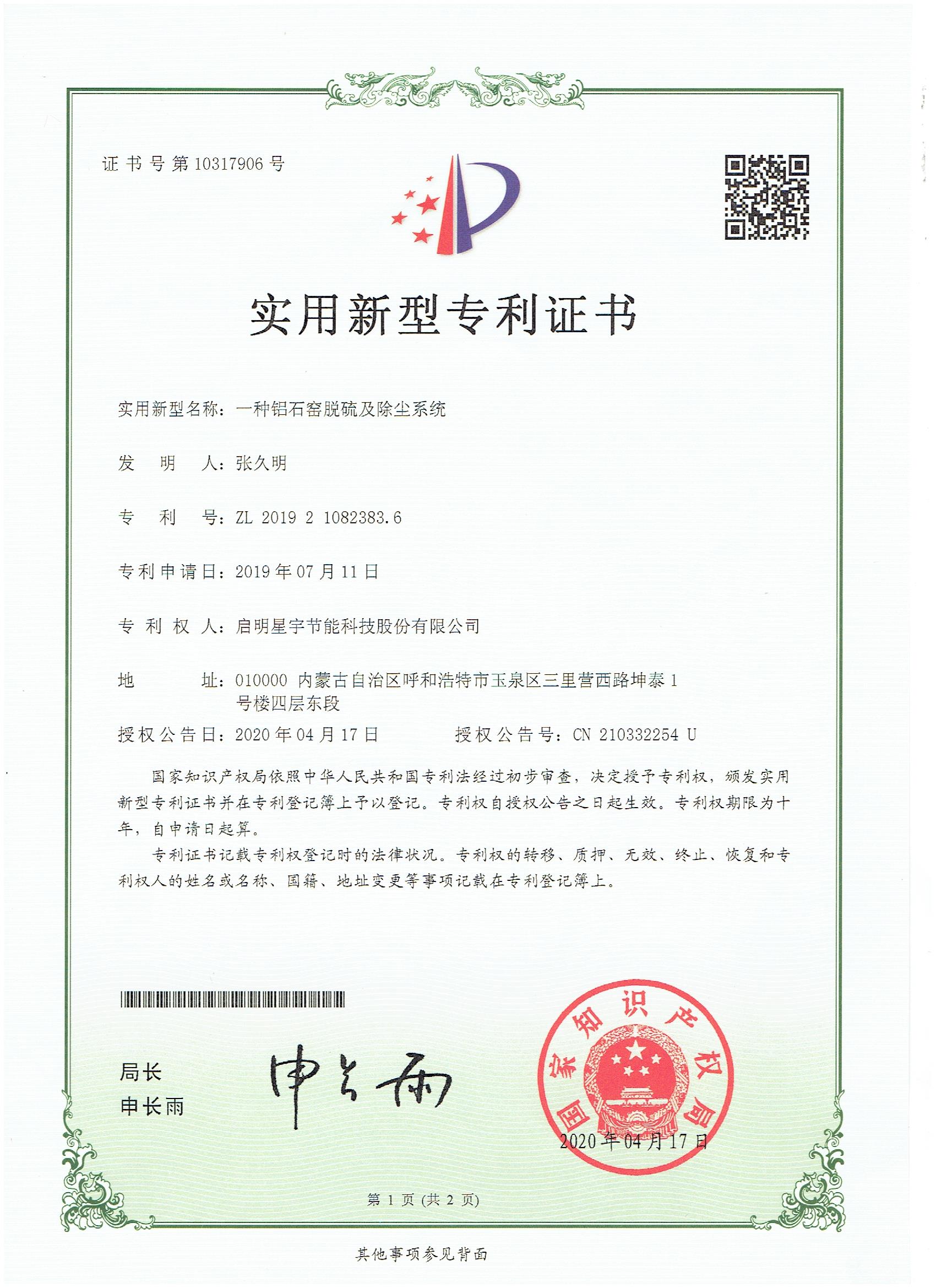 一種鋁石窯脫硫及除塵系統實用新型專利