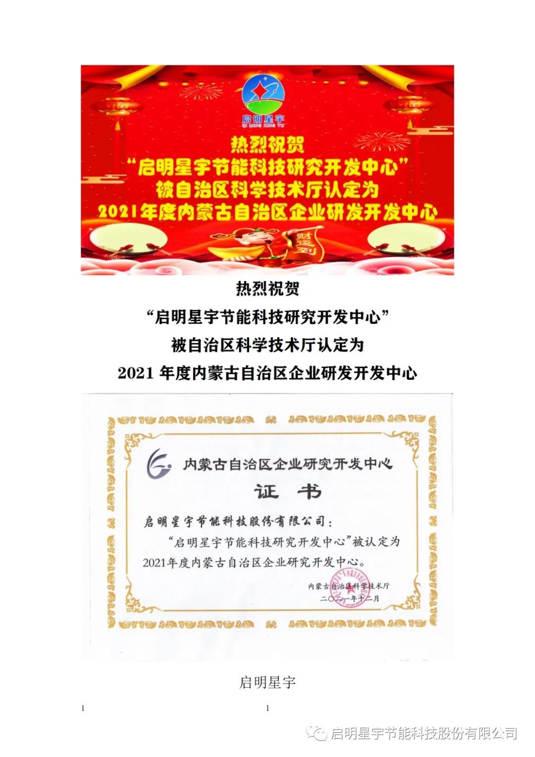 熱烈祝賀啟明星宇研發中心,升級為《2021內蒙古自治區企業研發開發中心》