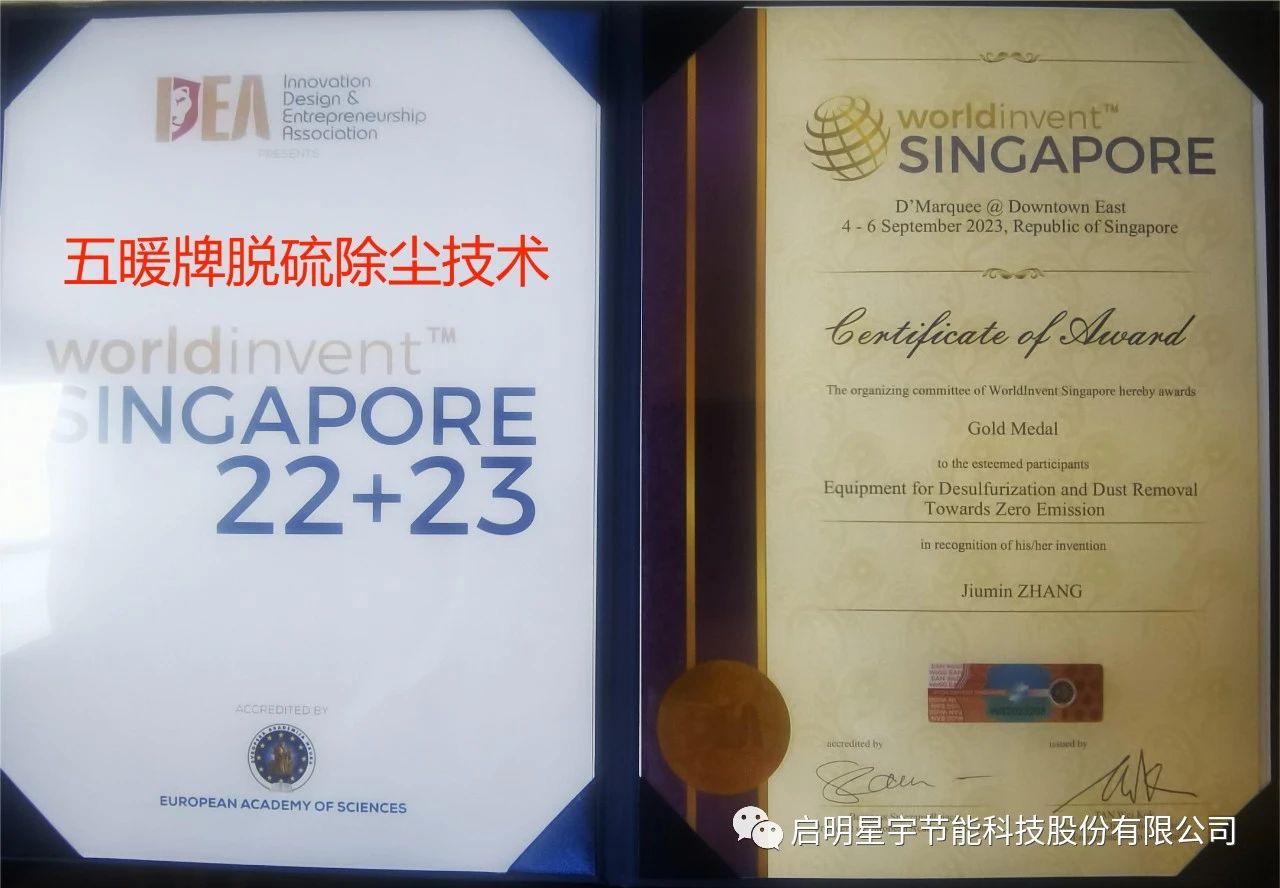 2023年9月新加坡國際發明展覽會,授予五暖牌脫硫除塵脫硝一體化設備《全球原創發明獎》,是對啟明星宇10年研發成果的肯定,同時,體現出為全人類服務的能力和價值,專利技術轉化產品,全球原創唯一性,企業品牌得到進一步提升!